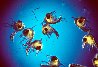 Copépodes (acima ) é um dos zooplankters mais comuns. Eles se alimentam de diatomáceas e são freqüentemente encontrados em grandes números quando diatomáceas estão florescendo. Copépodes bebê (abaixo) não têm antenas longas e cauda, mas cultivá-la muito em breve.